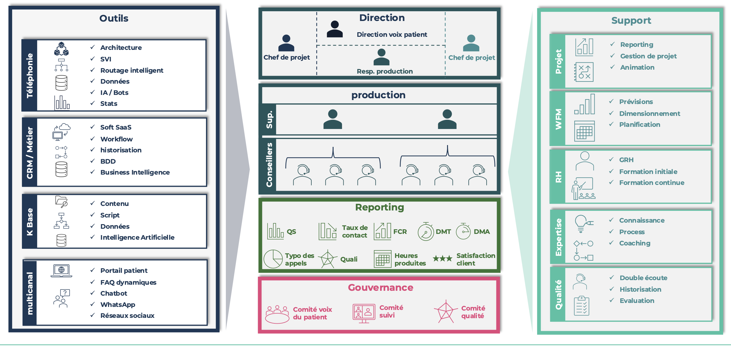Au cœur de cette architecture, on retrouve les conseillers et leurs superviseurs, véritables premiers maillons de la chaîne de contact. Ils interagissent avec les patients au quotidien et incarnent la qualité de la relation.
